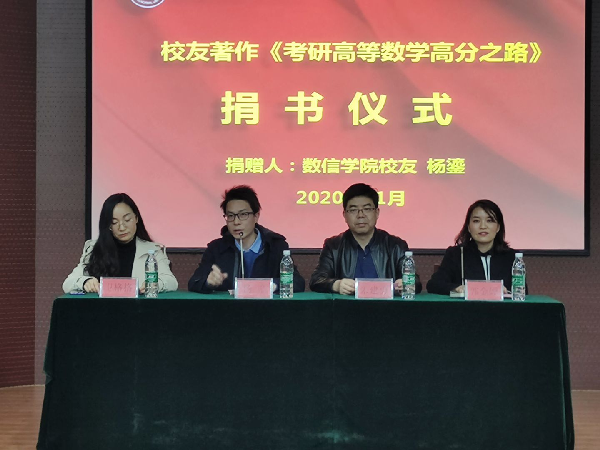 11月12日,数学与信息科学学院举办捐书仪式暨考研专题报告会,数信院党委副书记郭金婵主持会议,校友会秘书处副秘书长朱建勇、校友会秘书处办公室主任杨华、图书馆文献建设部主任卫格格参加了活动,学校考研学生100余人参加了此次活动。